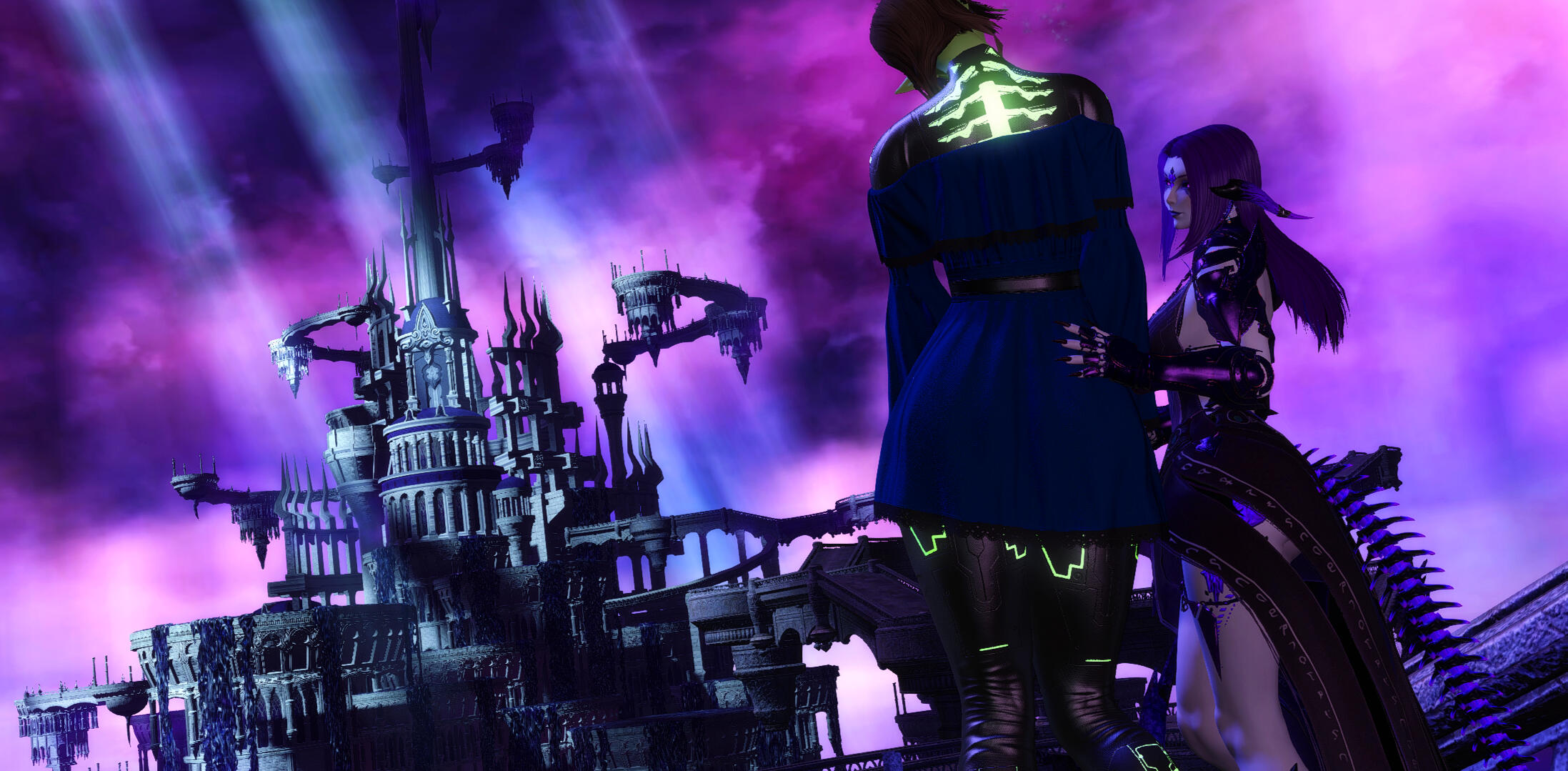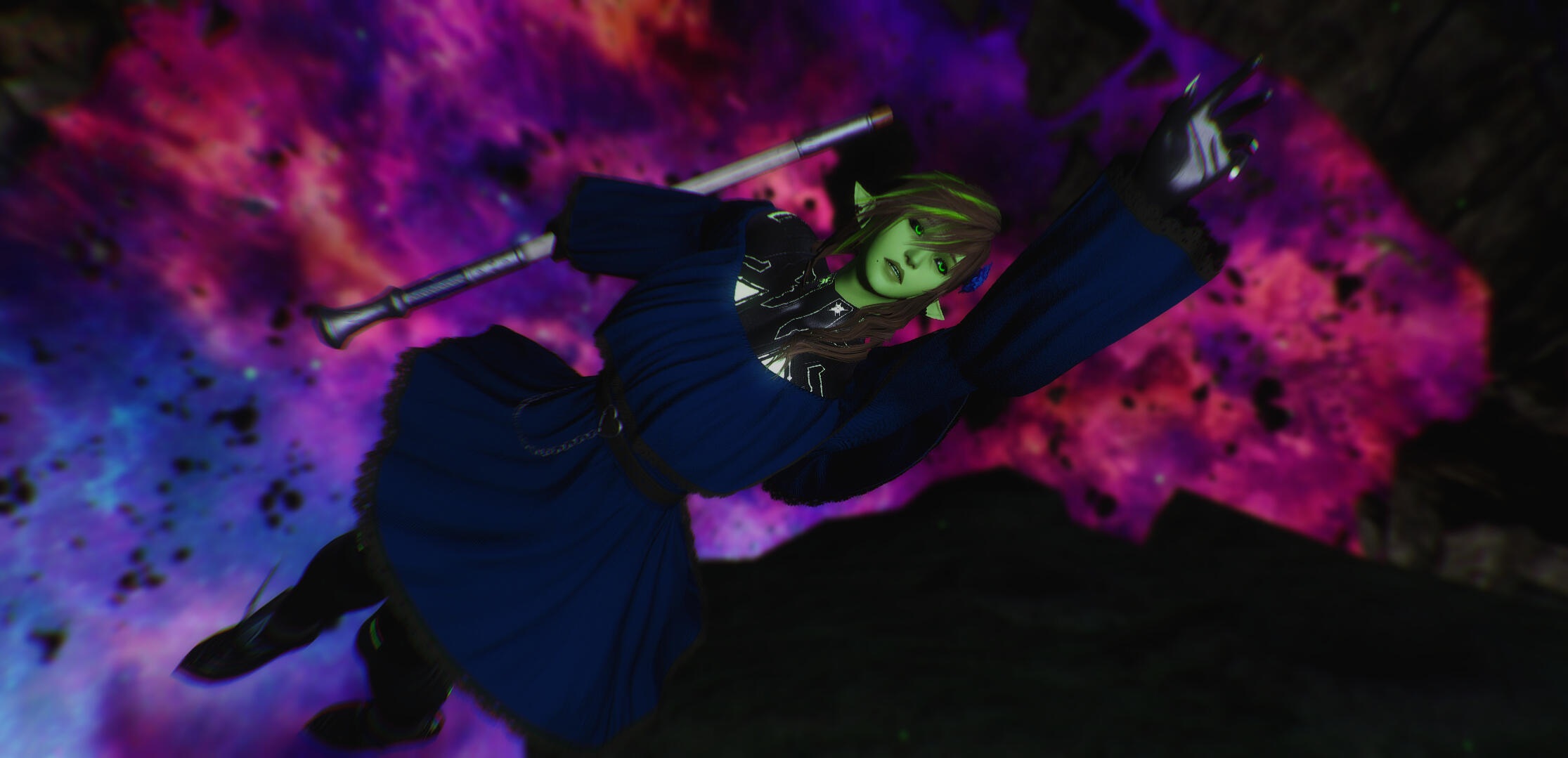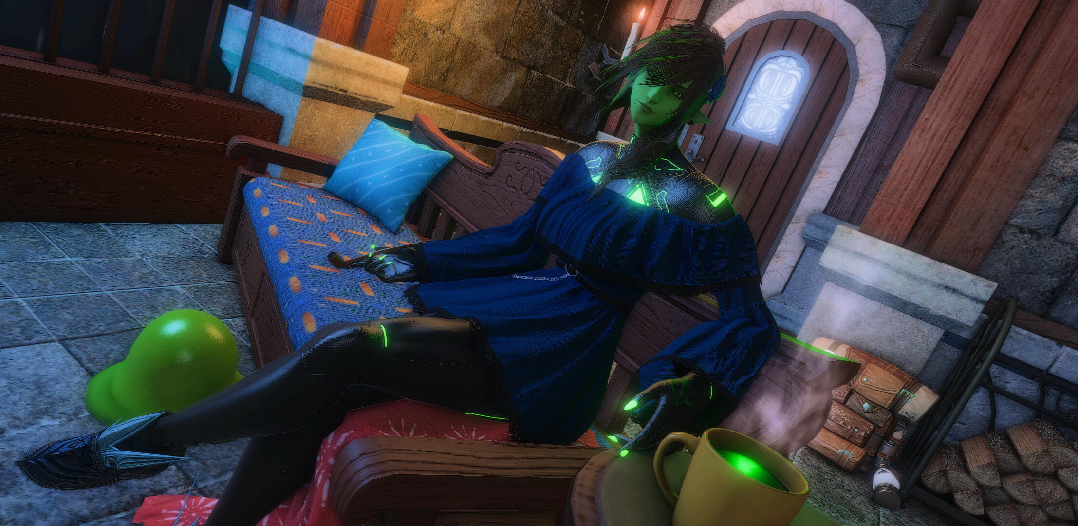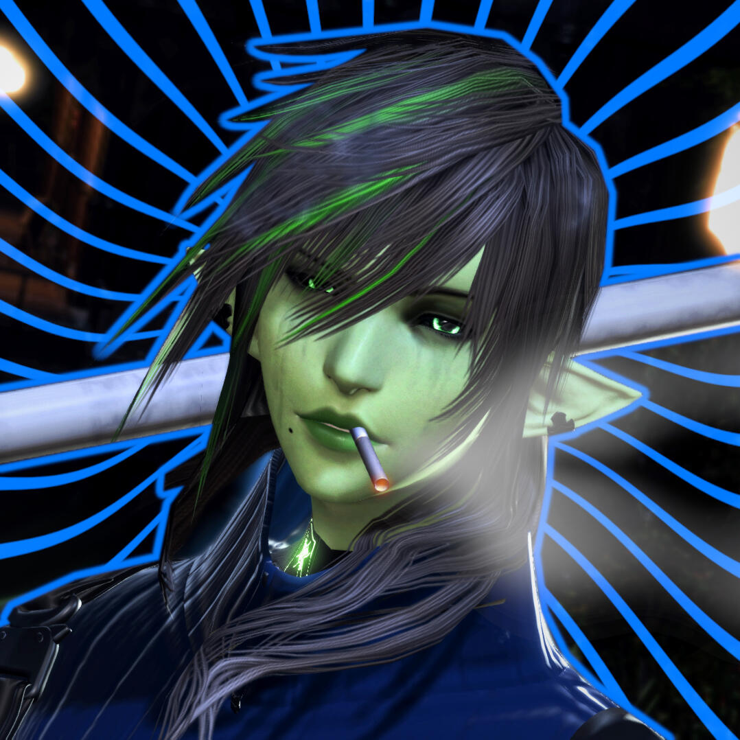Veteran - Lylisandre has the accent, vocabulary, delicate mannerisms, and heavily armored fashion sense of an Ishgardian Knight, but she curses, chainsmokes, and makes inappropriate jokes like a common Ul'dah mercenary.Membrane - Though typically hidden underneath armor & robes, Serraithe is never seen without her unique magitek softsuit: a rubbery black bodyglove, lined with distinct glowing green geometric patterns, which encapsulates her entire body from the neck down.Monstress - Lylisandre has the telltale signs of void corruption upon her: discolored skin, darkened sclera, glowing eyes, and an unnatural timbre to her voice.Witch - The pommel of the cane she walks with houses an old diamond-shaped soul stone, similar to those used by Street Magicians to mimic the magic of monsters. Strangely, all of her spells emit an eerie emerald light and leave behind a sticky, gelatinous residue.